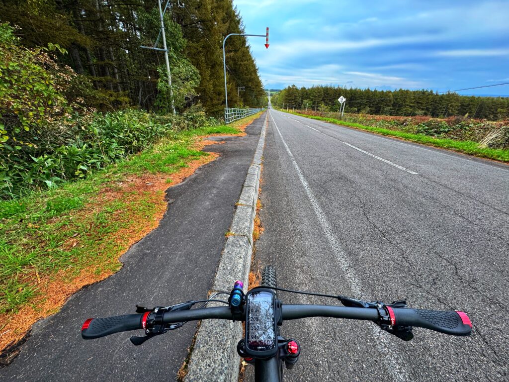 長い長い直線のダウンヒル.このエリアを代表する風景.