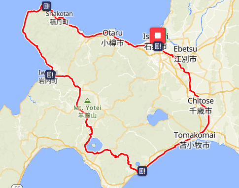 スタートは倶知安なので,積丹周りでぐるっと300kmかなぁ...と思ったがたぶん違う.