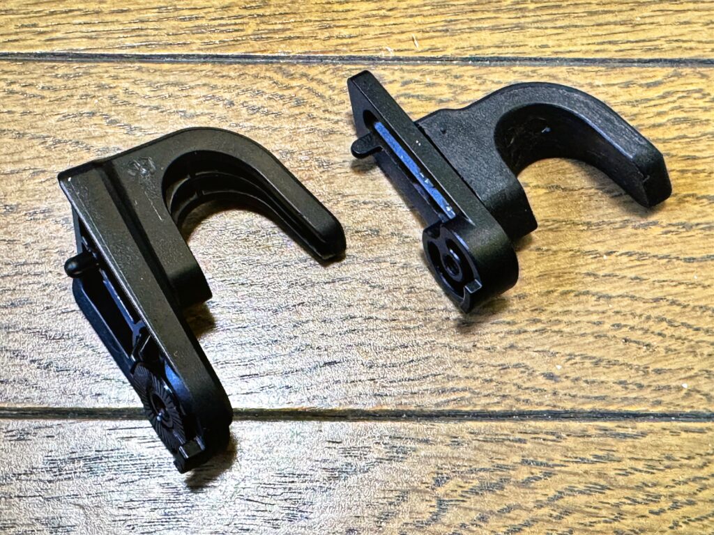 フロントフォークに付いている折りたたみ用フックも,高さが調整できるタイプに交換(アリエクで購入).